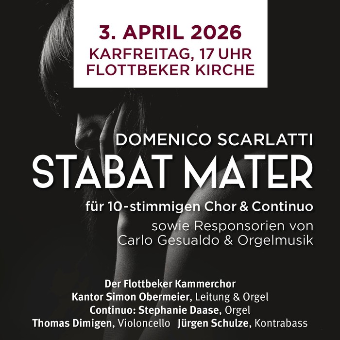 Domenico Scarlattis zehnstimmiges Stabat Mater kann als Meisterwerk innerhalb der Chorliteratur bezeichnet werden. Es erklingt eine aufwühlende Klangwerdung des mittelalterlichen Gedichts, das die Schmerzen Marias schildert, während sie unter dem Kreuz steht. Der große Umfang, der zupackende dramatische Schwung und die lyrische Anmut verbunden durch eine klare stilistische Einheit stellen das Werk in den Kreis der großen Vokal-Kompositionen der ersten Hälfte des 18. Jahrhunderts. Erleben Sie dieses außergewöhnliche und selten aufgeführte Meisterwerk in unserer Kirche in Kombination mit Chormusik von Carlo Gesualdo und Orgelmusik von Johann Sebastian Bach. Der Eintritt ist frei.